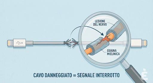 Il suo cavetto continuerà a funzionare, ma in quel punto si sarà creata una lesione che andrà poco a poco a rovinare la ricarica e quindi a non far funzionare più correttamente il suo cavetto. Ecco, questo succede alle sue terminazioni nervose con la sclerosi multipla”